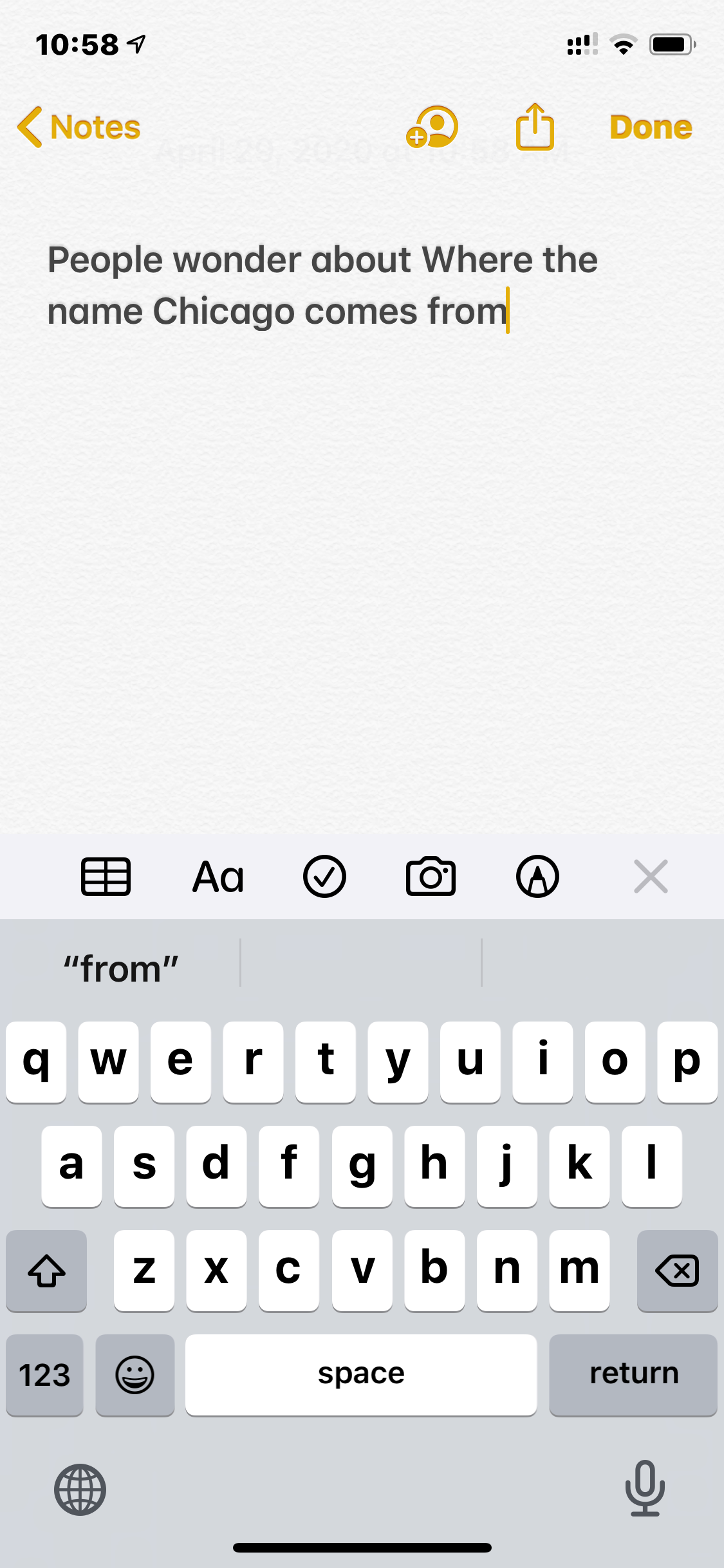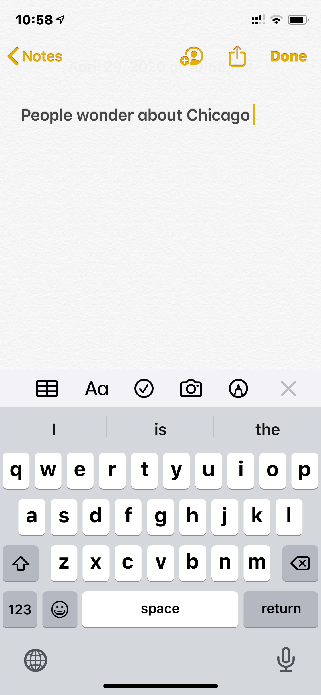 Auto-correct capitalized “Chicago” for me, which is wonderful. But when I changed my sentence, it capitalized the word “Where” inappropriately. Note you can double-tap “Chicago” to get around it, but text editing can be fiddly so I usually just backspace.