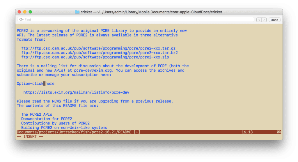 But unless you’re an expert, the commands can be hard-to-remember and tedious. It’s also not very Mac-like. A little gem in Terminal is that you can option-click inside an editor to move your cursor to that position. In the screenshot below, my cursor was near the bottom of the view and I option-clicked right between “option-click” and “here” in the middle of the document.