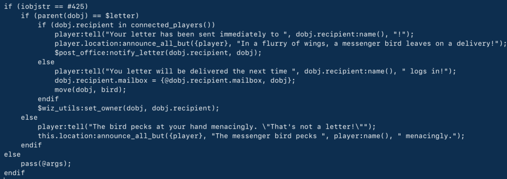 I liked this because the built-in messaging system was more like an email program and I wanted something more retro. Anyways, here’s some example code that runs when you hand the letter to the bird.